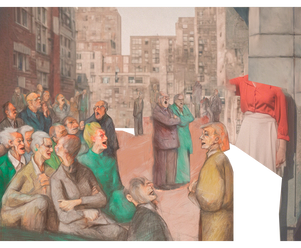 A painting of a trans woman speaking to a group of people, agitated crowd, man and woman, painting by Bernardino Campi, shutterstock, contemporary, preaching in a city, chalk colors, dressed in a red and white dress, wide-perspective, school, surrounding the city, pointing, on her right hand, spring, pitt, album, blue fabric